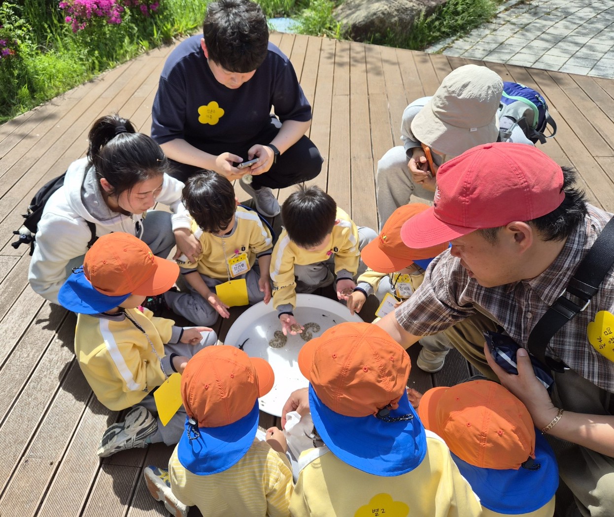 유아와 보호자가 인근에서 발견한 도룡뇽알과 올챙이알을 탐색하고 있다.