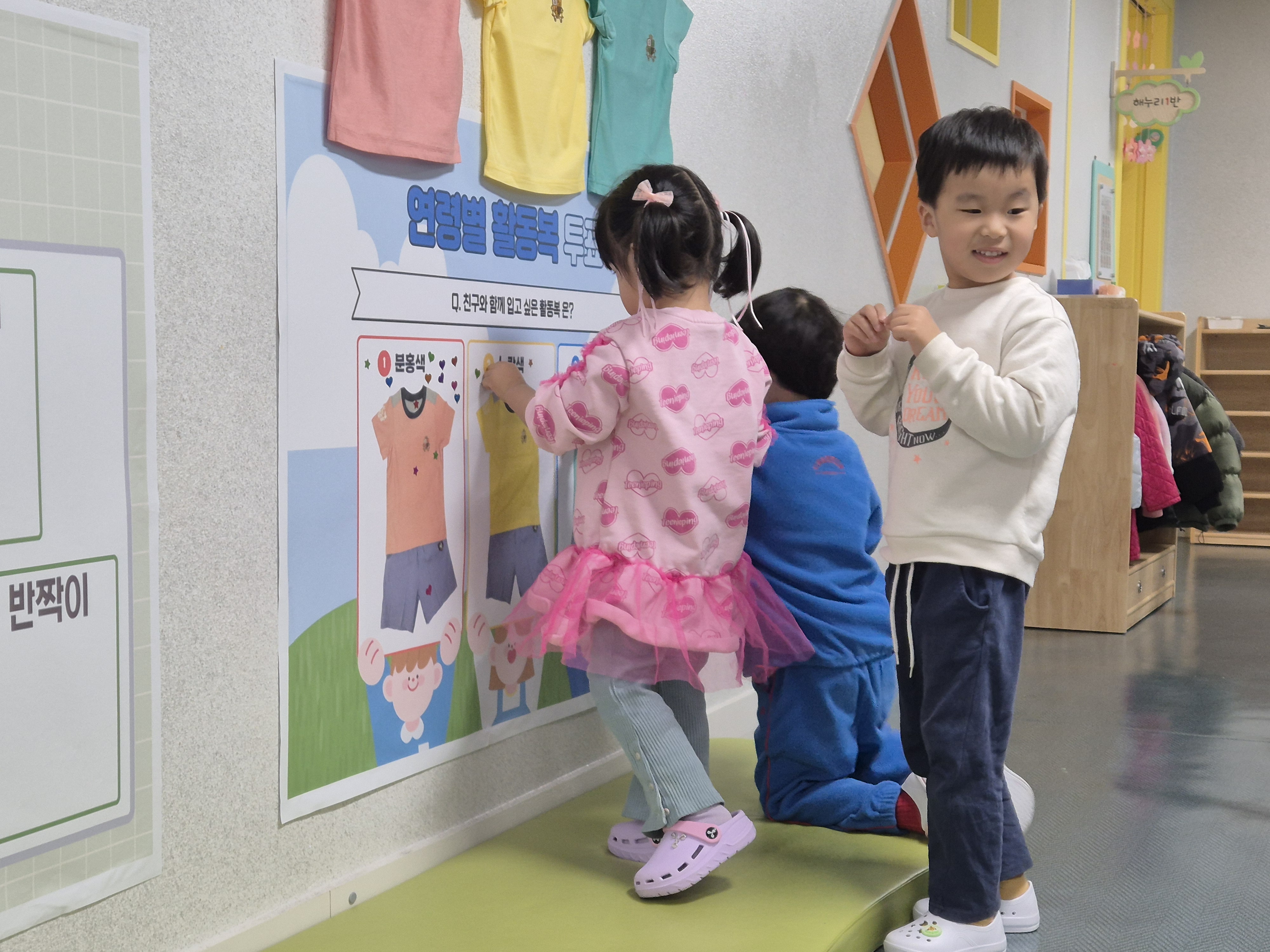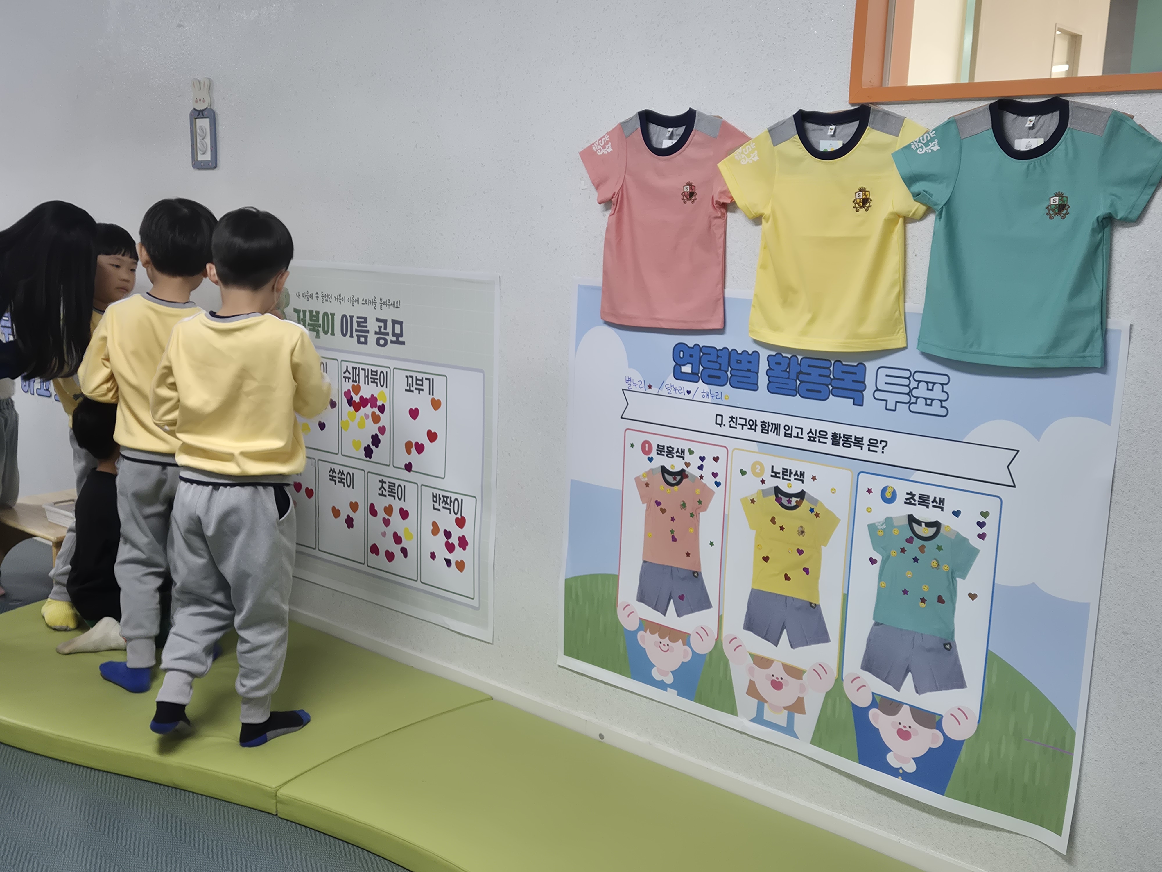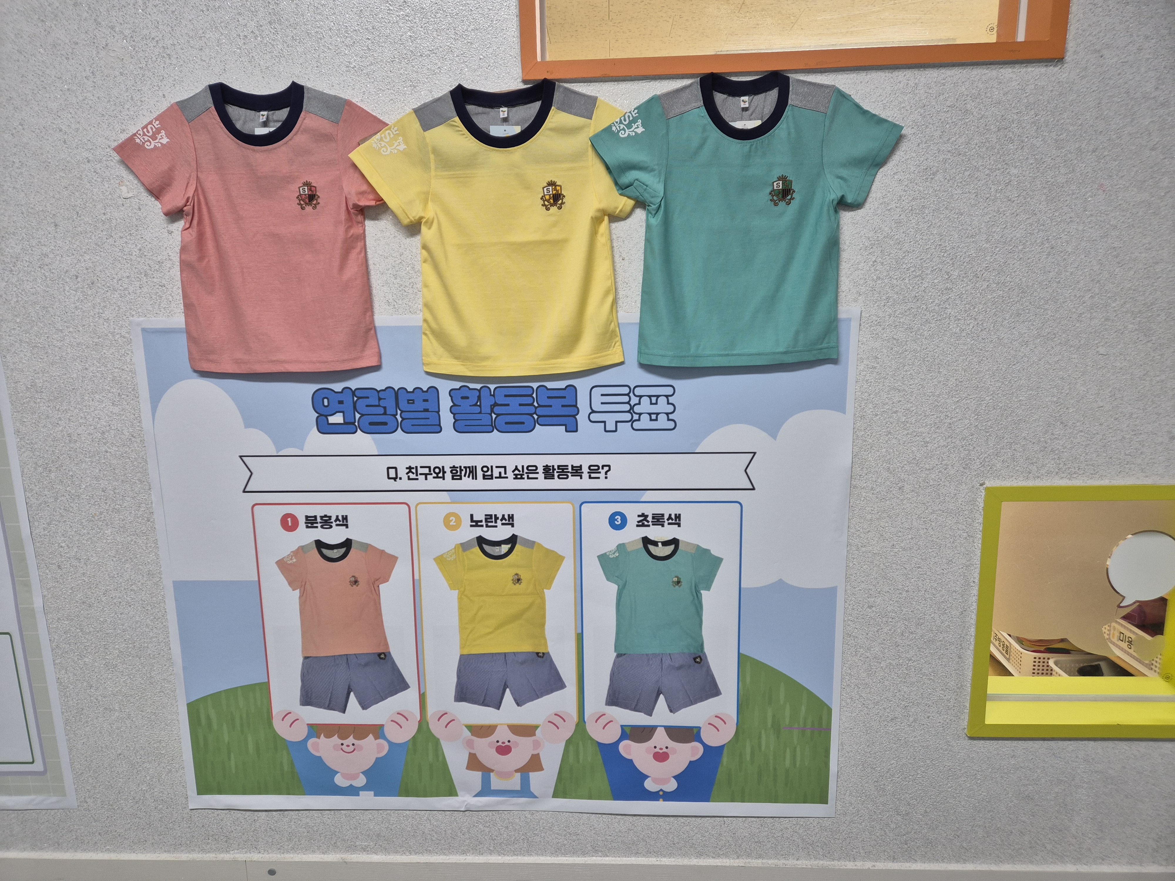 [우리들의 여름 하복 색깔 결정 프로젝트] 자신이 입고 싶은 여름 하복 색깔을 후보 중에서 선택합니다. 아이들은 게시판에 직접 스티커를 붙이며 자기 의사를 표현하고, 가장 많은 선택을 받은 색깔이 실제 원복으로 제작되는 과정을 지켜봅니다.